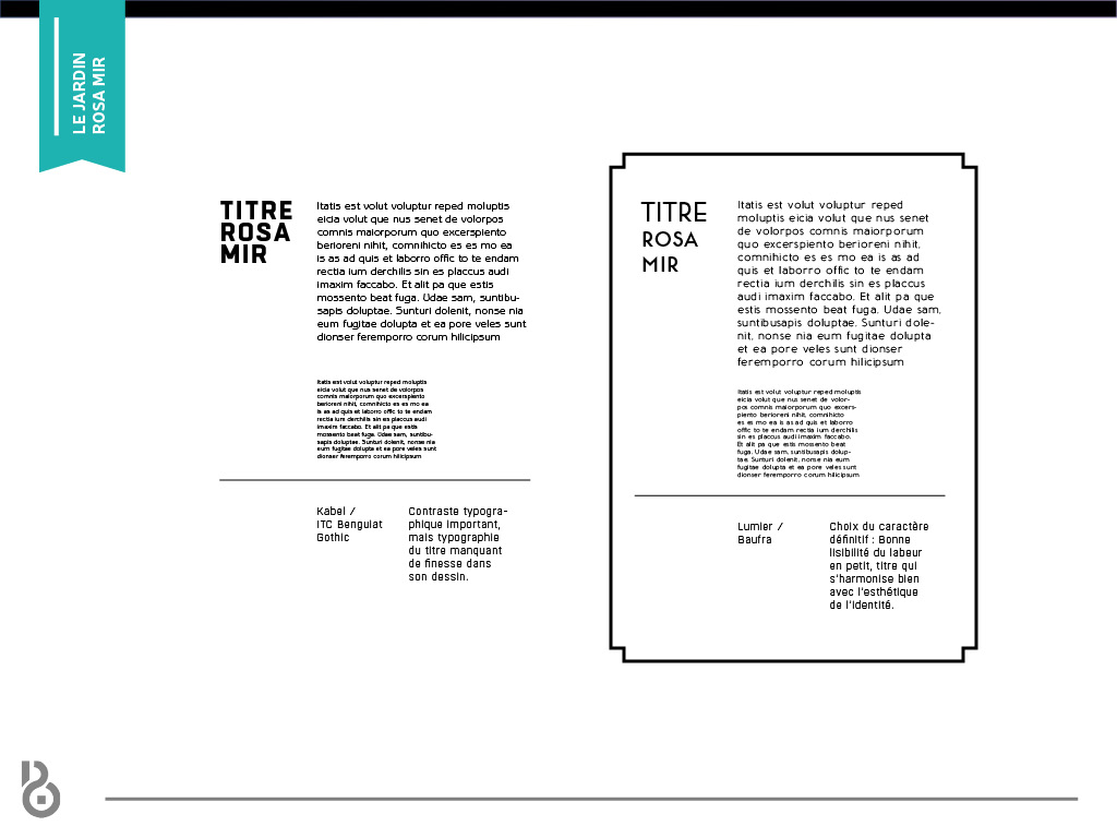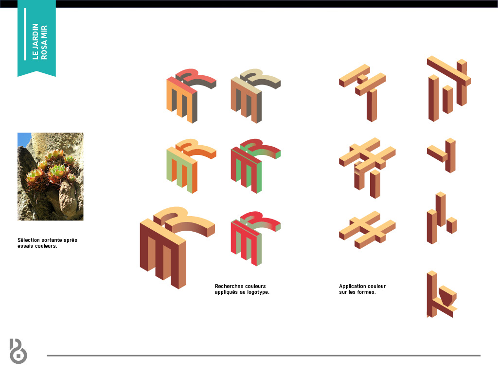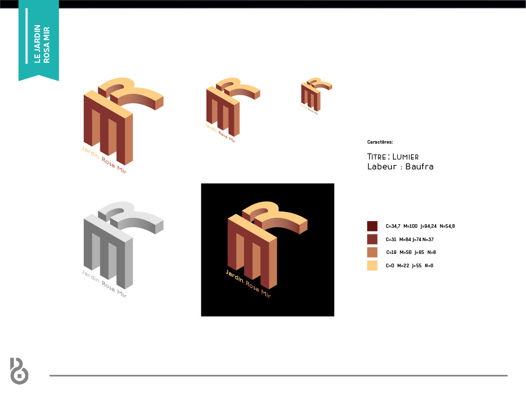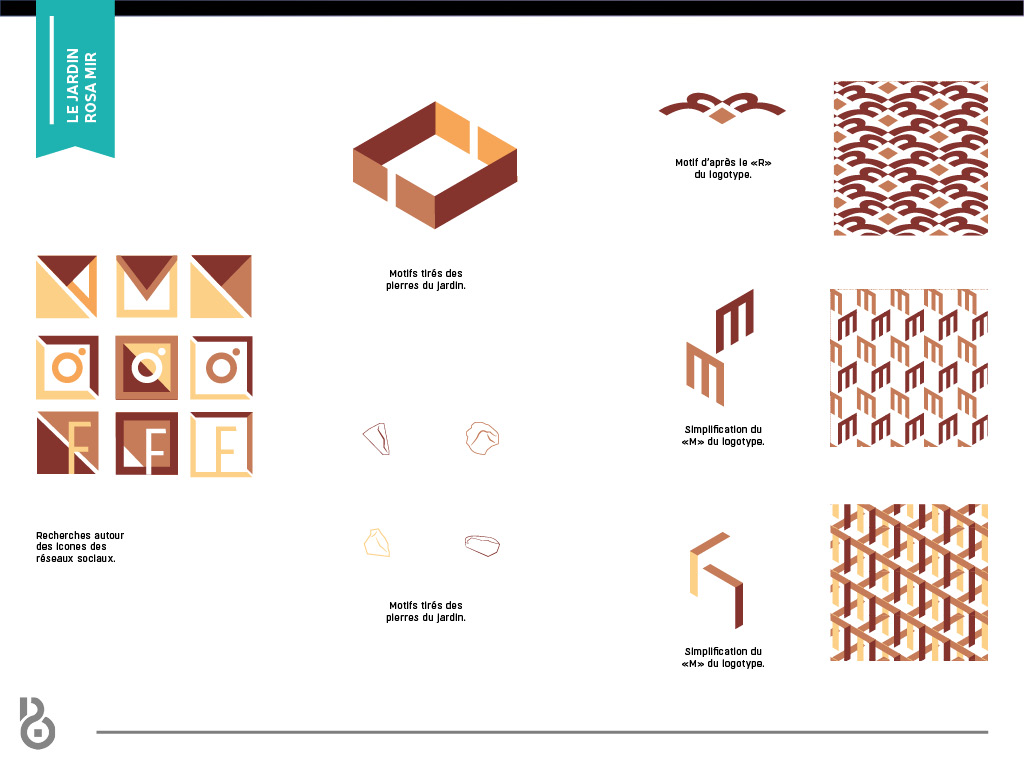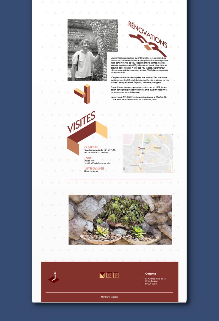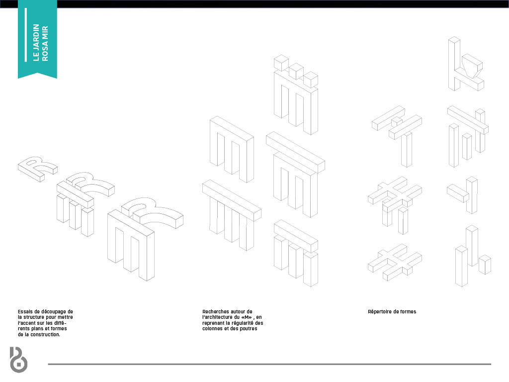 Identité visuelle et webdesign du Jardin Rosa Mir à Lyon. L’identité se base sur l’architecture particulière du jardin, composée essentiellement de structures superposées et entrecoupées les unes aux autres.